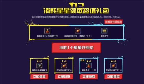 活动三在线累积时间获得星星兑换道具抽取深渊票和会员。