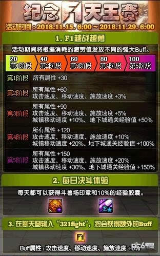 为各位带来dnf纪念F1天王赛活动地址,参与到dnf纪念F1天王赛活动的玩家朋友们将可以获得各种道具和BUFF奖励,下面我们就来看一看dnf纪念F1天王赛活动奖励介绍一览吧,希望对各位有所参考。
