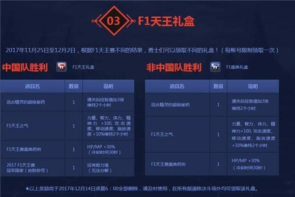 4.2017年11月25日至12月2日,根据F1天王赛不同的结果,勇士们可以领取不同的礼盒!(每帐号限制领取一次)