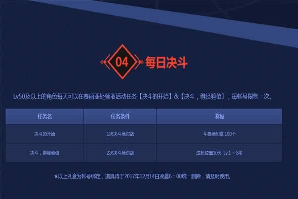 5.Lv50及以上的角色每天可以在赛丽亚处领取活动任务【决斗的开始】&【决斗,得经验值】,每帐号限制一次。