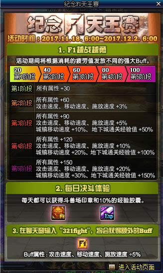 3.2017年11月18日至12月2日,在游戏内聊天窗口发送含有“321fight”的文字,可获得buff。
