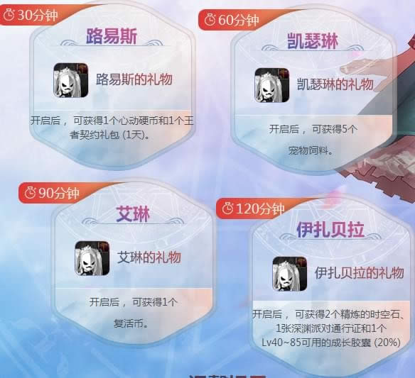 2.活动期间,勇士们每天上限达成30、60、90、120分钟即可获得相应NPC的礼物盒!