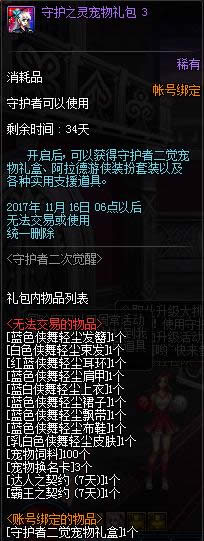 3.使用守护者二觉宠物自选礼盒后,可以在4种女圣职者二觉宠物中选择1种获得,宠物无法交易,无删除时间。