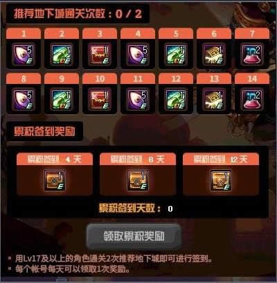 1.每日Lv17级以上的角色在6:00~次日6:00之前通关2次推荐地下城即可完成签到