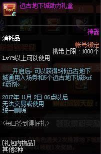 开启后,可以获得1个远古装备礼盒(开启后可以获得1件远古地下城任务传说系列防具)和3种主线任务完成券