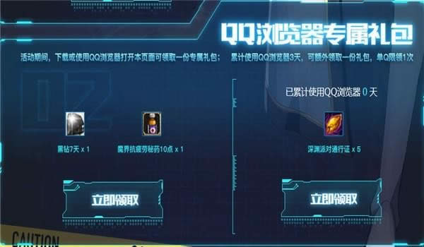 3. 活动期间,下载QQ浏览器或登录浏览器打开本页面领取一份专属礼包;连续使用QQ浏览器3天,可额外领取礼包一份,单Q各限1次