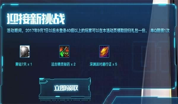 2. 活动期间,2017年9月07日以后未登录40级以上的玩家可以在本活动页领取回归礼包一份,单Q限领1次