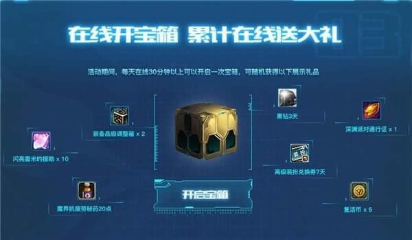 4. 活动期间,每天在线30分钟以上可以开启一次宝箱,可随机获得以下展示礼品,连续抽奖6天可以开启终极宝箱