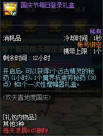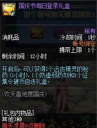 10.6国庆节每日登录礼包开启后, 可以获得1个远古精灵的秘药 (1小时,3倍)、 1个防虚弱药剂和1个征集令硬币自选礼盒。