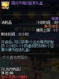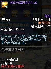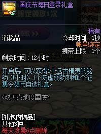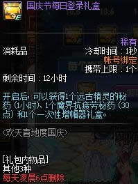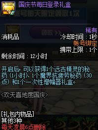 10.2国庆节每日登录礼包开启后, 可以获得1个远古精灵的秘药 (1小时,3倍)、 1个防虚弱药剂和1个征集令硬币自选礼盒。