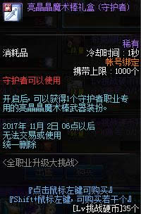 2. 以上道具除了《任务传说防具自选礼盒》,《亮晶晶魔术棒礼盒 (守护者)》和《净化之石礼盒(100个)》为账号绑定外均为无法交易;