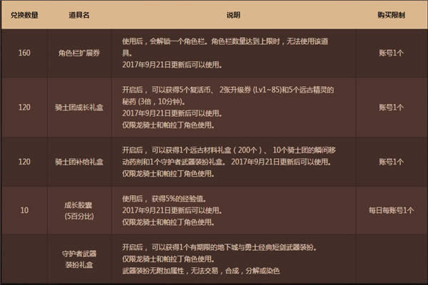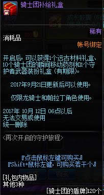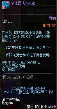 3.活动期间,Lv17及以上玩家在推荐地下城内可以获得【骑士团的盾牌】使用【骑士团的盾牌】可以在赛丽亚房间内的迷你守护者NPC处兑换奖励