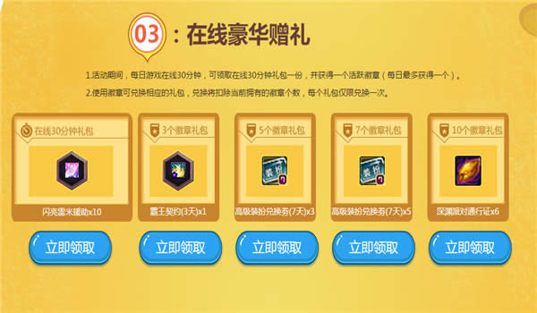 【4】活动期间,每日游戏在线30分钟,可领取在线30分钟礼包一份,并获得一个活跃徽章(每日最多获得一个)。