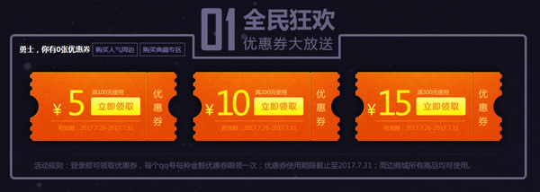 登录即可领取优惠券,每个qq号每种金额优惠券限领一次;优惠券使用期限截止至2017.7.31;周边商城所有商品均可使用。