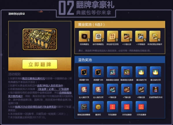 1、玩家在商城购买任意商品满90元可获得一次翻牌机会(所有典藏包不参加此次活动);
