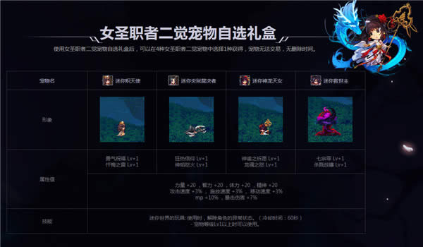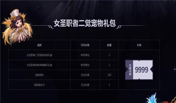 2.女圣职者二觉宠物礼包每个角色仅限购买1个。