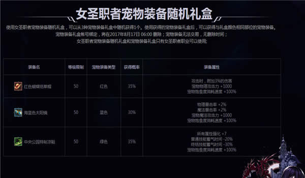 4.女圣职者二觉宠物礼包、女圣职者二觉宠物自选礼盒、女圣职者宠物装备随机礼盒、宠物装备礼盒都会在2017年8月17日 06:00删除。