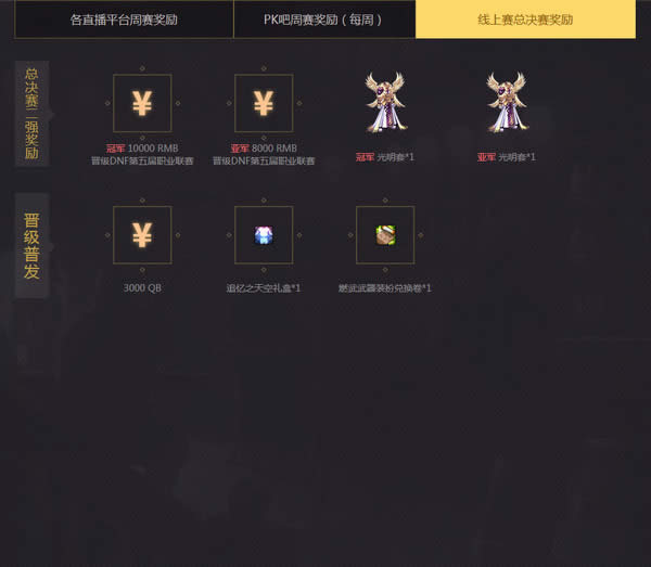DNF第五届职业联赛线上预选赛来啦!本次线上赛由DNF官方联合DNF PK吧、龙珠、斗鱼、虎牙、熊猫举办,将由PK吧统筹报名和协调赛事,每周将会产出2各名额进军线上赛总决赛,最终线上赛6强选手将会在线下决出前2名晋级DNF第五届职业联赛