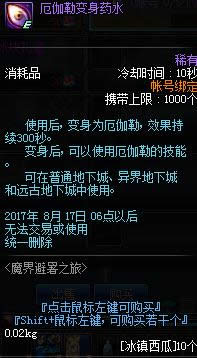 使用后,变身为厄伽勒,效果持续300秒。变身后,可以使用厄伽勒的技能。可在普通地下城、异界地下城和远古地下城中使用。