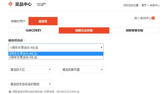 然后咱们选中【领取活动奖励】一栏,根据自己对应的大区来领取礼包就可以啦!