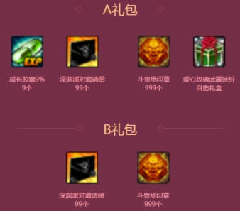 (礼包A包含成长胶囊9%9个、深渊派对邀请函99张、斗兽场印章999个、爱心玫瑰武器装扮自选礼盒一个)
