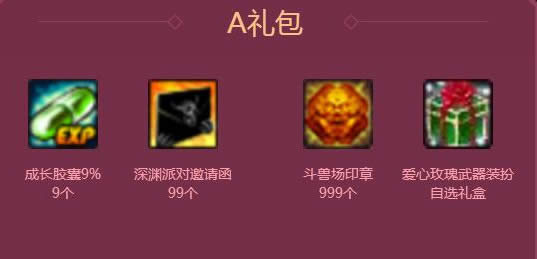 礼包A包含成长胶囊9%9个、深渊派对邀请函99张、斗兽场印章999个、爱心玫瑰武器装扮自选礼盒一个。
