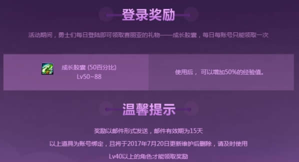 活动期间,勇士们每日登陆即可领取赛丽亚的礼物——成长胶囊,每日每账号只能领取一次