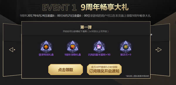 2、本次活动中所有礼盒奖励均为帐号绑定,本次活动中的9周年享大礼第一弹、第二弹、第三弹、第四弹&欢乐代币券奖励将于2017年7月6日更新维护后删除;其他奖励将于7月20日更新维护后统一删除,请及时使用;史诗跨界石将在8月17日删除。