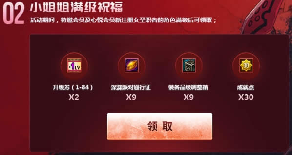 活动期间,特邀会员及心悦会员新注册女圣职者的角色满级后可领取;