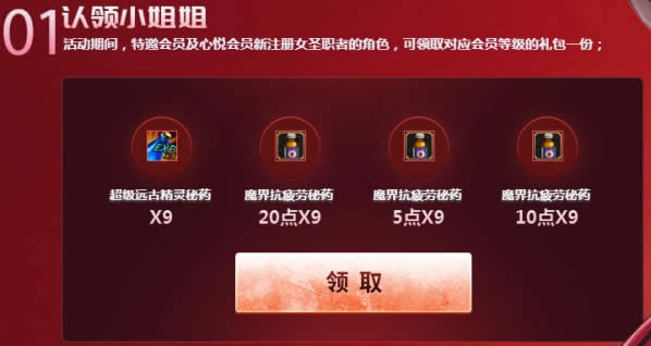活动期间,特邀会员及心悦会员新注册女圣职者的角色,可领取对应会员等级的礼包一份;