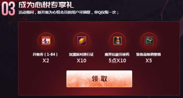 4.在活动期间新升级为心悦会员的用户,可领取一份成为心悦礼,单Q仅限一次;
