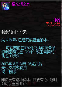 失去效果,已经变成普通的水。可在赛丽亚NPC处兑换成装备品级调整箱礼盒(20个)或王者契约礼包(7天)。