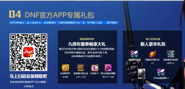 打开DNF助手,进入活动中心,点击置顶的“九周年登录畅享大礼”和“APP新人礼包”,即可领取!