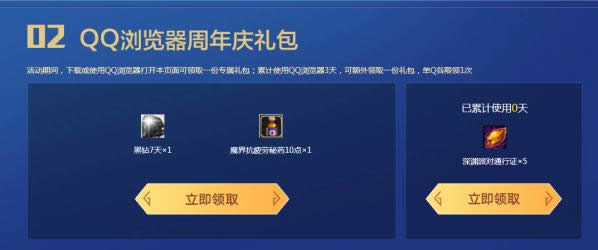 3、活动期间,下载QQ浏览器或登陆浏览器打开本页面领取一份专属礼包;累计使用QQ浏览器3天,可额外领取礼包一份,单Q各限领1次;