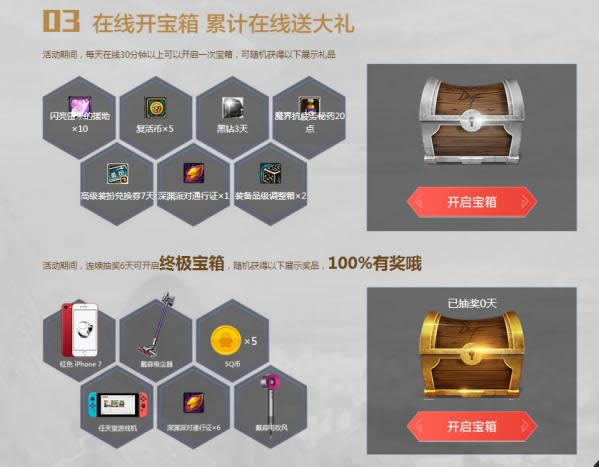 活动期间,每天在线30分钟以上可以开启一次宝箱,可随机获得以下展示礼品。