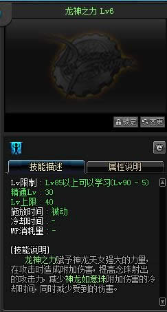 龙神之力:二觉被动,追加伤害,是白字,另外增加念珠射出攻击力(比较鸡肋),减少一半一觉被动的追伤冷却(这个非常有用,提升很可观),满上就是了。