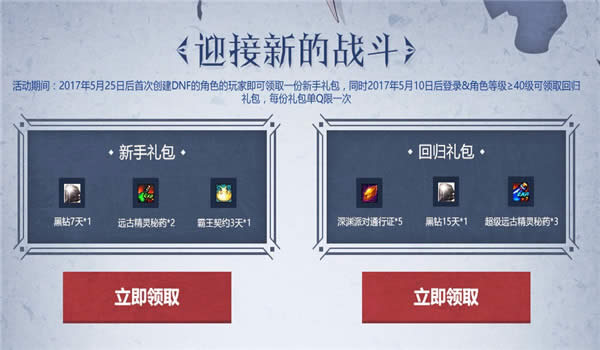 12017年5月25后创建的角色可以领取回归礼包和新手礼包一份。