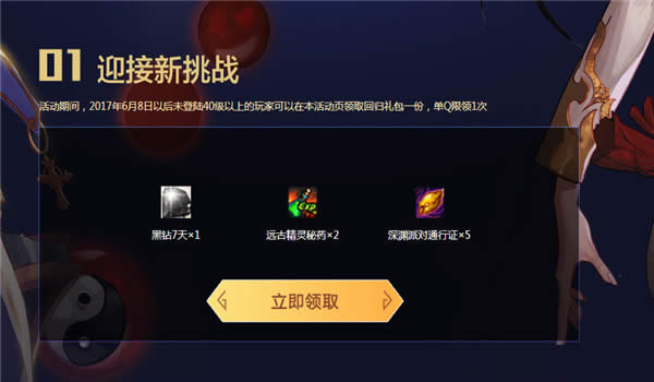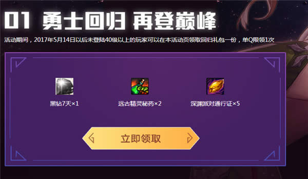 2.活动期间,2017年5月14日以后未登陆40级以上的玩家可以在本活动页领取回归礼包一份,单Q限领1次;
