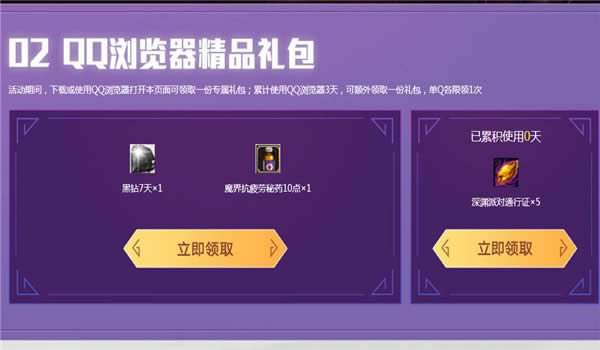 【2】活动期间,下载或使用QQ浏览器打开本页面可领取一份专属礼包;累计使用QQ浏览器3天,可额外领取一份礼包,单Q各限领1次