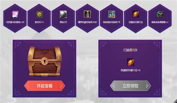 4.活动期间,每天在线30分钟以上可以开启一次宝箱,可随机获得以下展示礼品,连续抽奖6天可获得深渊派对通行证*6;