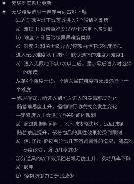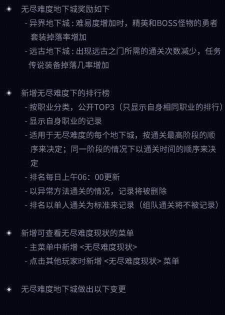 1.异界地下城/远古地下城新增无尽难度模式,原兑换所需远古材料删除,剩余远古材料可在NPC艾丽丝兑换传说装备兑换材料