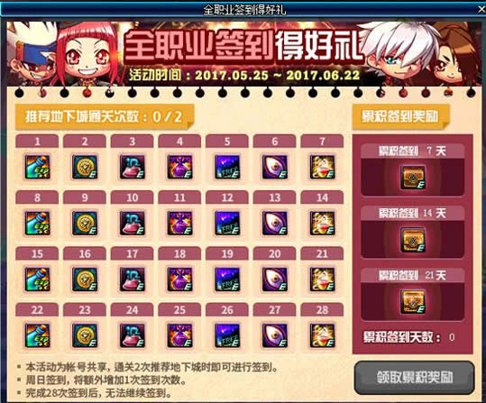 1.每日Lv17级以上的角色在6:00~次日6:00之前通关2次推荐地下城即可完成签到