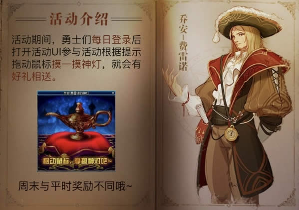 活动期间,勇士们每日登录后打开活动UI参与活动根据提示拖动鼠标摸一摸神灯,就会有好礼相送。
