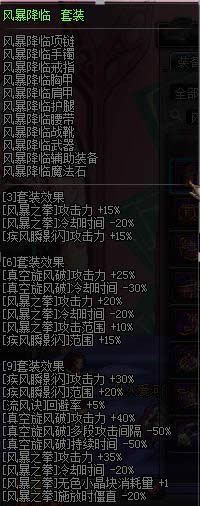 因为9件没有质变属性又对部位的限制太大所以定然是弱于6件的,把9件也列出来是考虑到实在没ss强散又舍不得花钱买强散的难民。这个套装主要对45技能风暴之拳增幅了大量的伤害也减少了技能本身的冷却,除此之外也对疾风瞬影闪和真空旋风破带来了一定的提升,而真空旋风破和风暴之拳属于逐风者主要的爆发技能,这让风暴降临在异界中处于一个较高的地位,6件套剩余部位根据已有ss强散或在下列纯散中选择自由搭配。