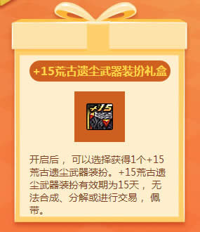 开启后, 可以选择获得1个+15荒古遗尘武器装扮。+15荒古遗尘武器装扮有效期为15天, 无法合成、分解或进行交易, 佩带。
