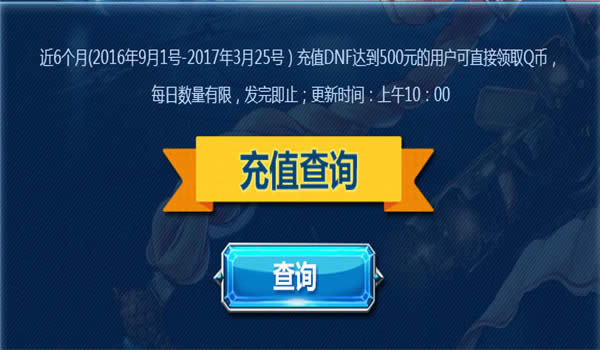 1.近6个月(2016年9月1号-2017年3月25号)充值DNF达到500元的用户可直接领取Q币,