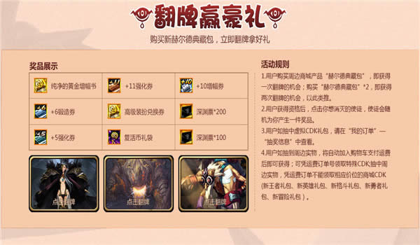 2.《使徒来袭Ⅱ》典藏包全新首发,内含:“赫尔德新版手办1个+冰箱贴3个+卡套(黑色、黄色二选一),送赫尔德宠物1个(+4%强化概率)+新王者礼包1个”。