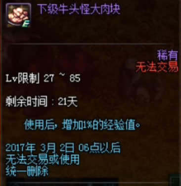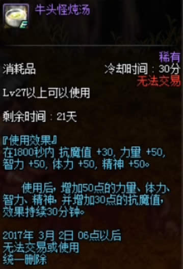 6.以及获得经验值,牛头怪炖汤Lv27以上玩家都可以使用;2以上道具均为无法交易,且将于2017年3月2日6:00更新维护后删除,请及时使用。