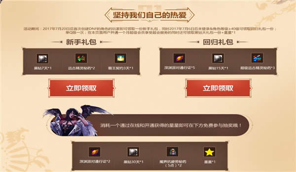 1、2017年8月30日起至9月30日未登录过DNF且账号中拥有一个40级角色玩家,即可领取回归勇士礼包一个,单个QQ限领一次;