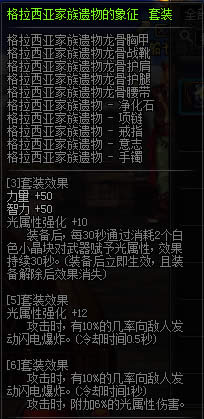 假猪套的真正名称为格拉西亚家族遗物,同样分为布甲、皮甲、轻甲、重甲和板甲,根据类型不同,附加的防御力、力量智力等也不同,但是套装属性是一样的,提升光属性强化和6%的光属性白字伤害。